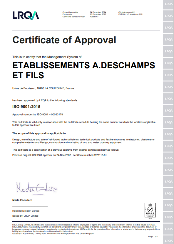 In order to deserve and to develop a know-how transmitted from generation to generation since 1860, DESCHAMPS' company gives a constant attention to its quality control which is based on a continuous improvement. The quality control of our products at all stages of its design, production and selling has enabled us to obtain ISO 9001 certification.