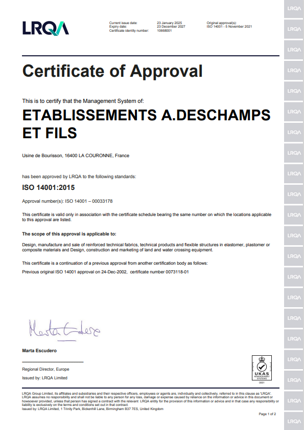 The Corporate Social Responsibility (CSR) is one of the pillars of DESCHAMPS. Since 1860, the DESCHAMPS ran through the biggest evolutions of the modern society. Starting from a small factory on a riverside, our company grew up with always the care of the environment in mind. DESCHAMPS has developed Mobi-mat® range including in this way, with environment-friendly products. Mobi-mat® ranges include recycled and biodegradable materials.